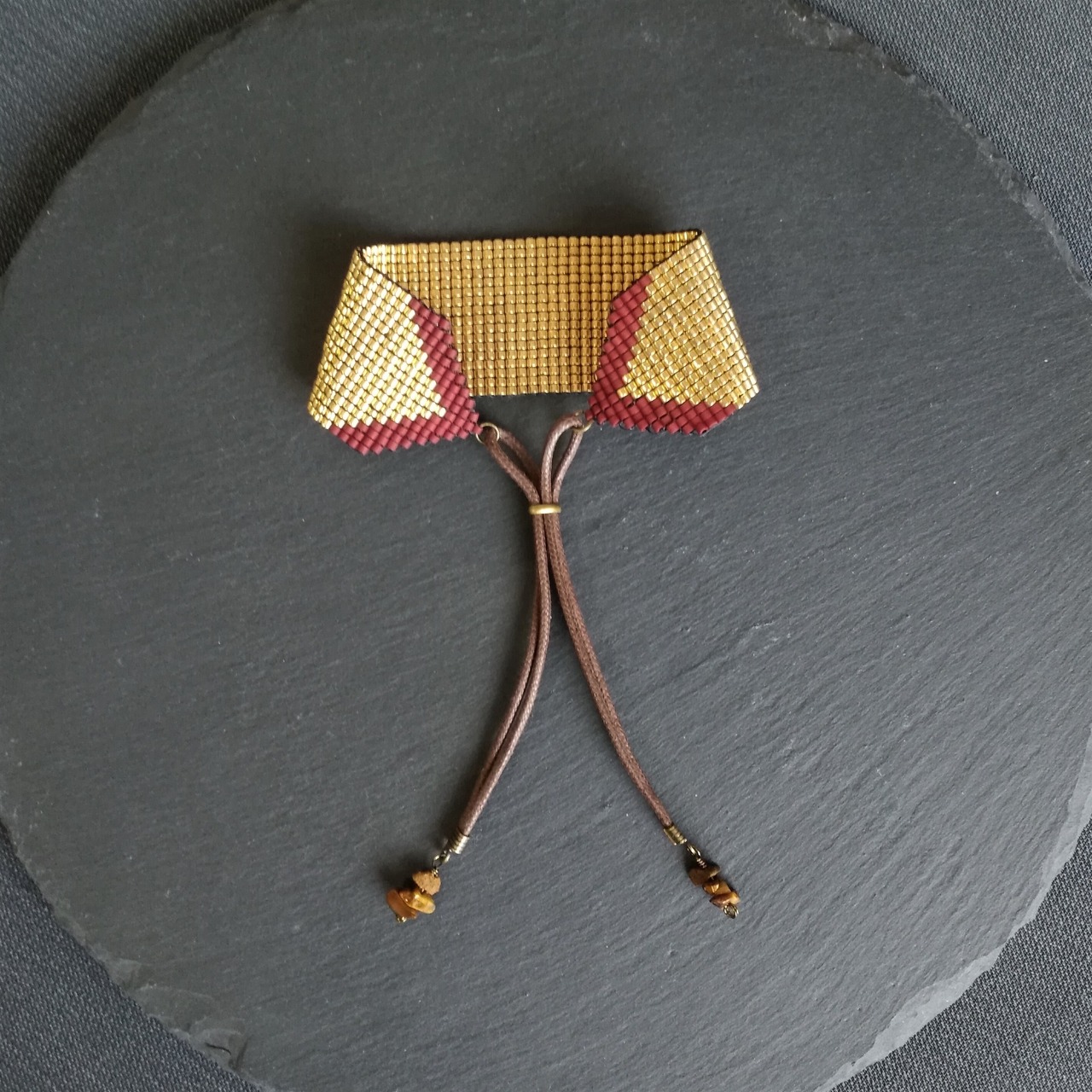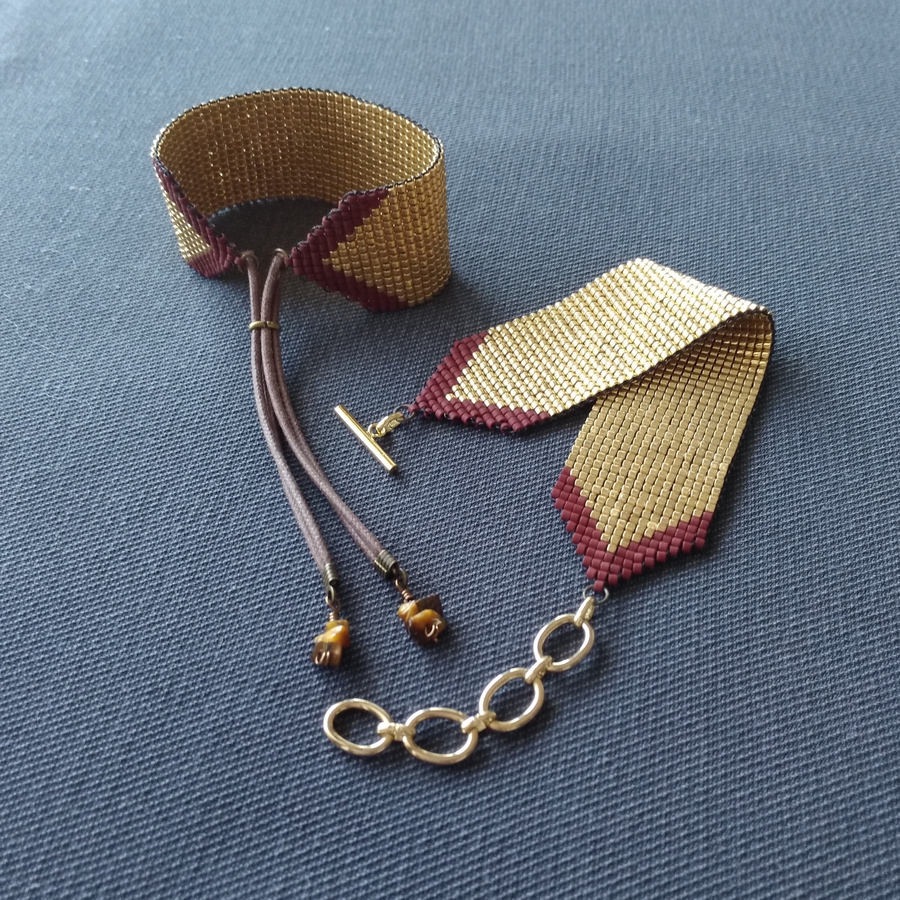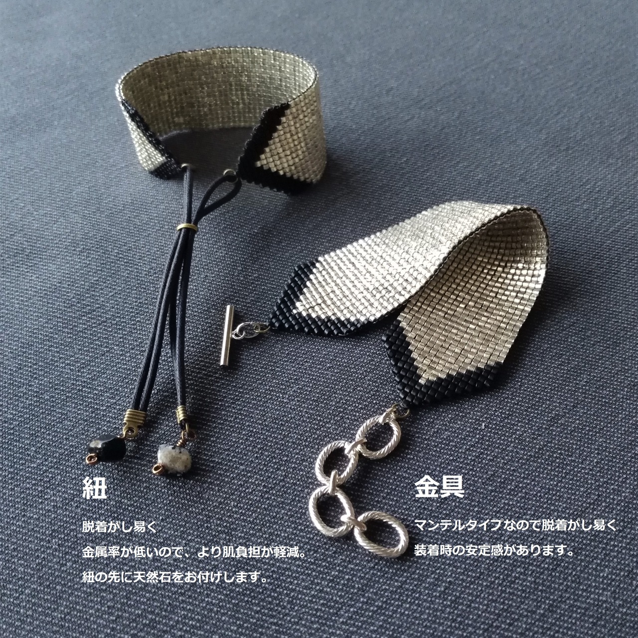 ガラスビーズ、天然石(タイガーアイ)、真鍮、コットン