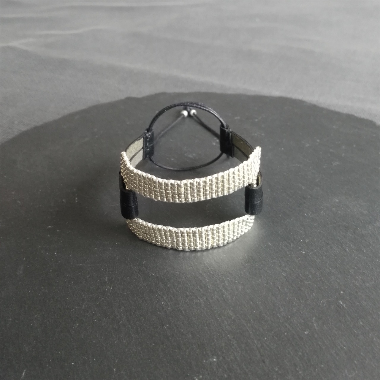 ガラスビーズを糸で丁寧に織り上げたモチーフ部も、サイズ調節部も通気性抜群、